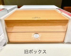 新ボックスは中央両サイドが空いており、よりシンプルになっています。旧ボックスは中央両サイドに、ギャランティーカバーや巾着が付いています。